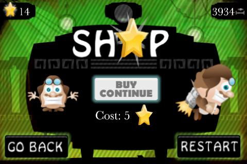 Don't fotget to pick up the stars, with the stars you can buy a Game Restart in the shop (the cost is 5 stars) to get you to the next level. Try to get the best distance and the highest score.